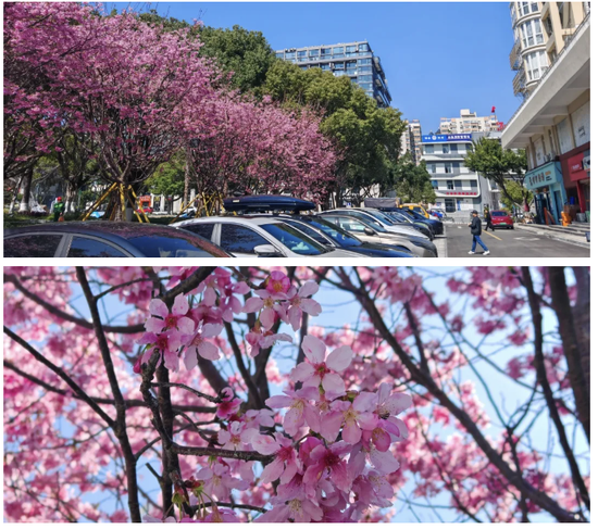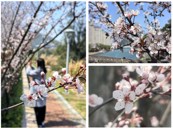 紧随紫叶李的脚步,樱花也次第绽放,将春日浪漫拉满。在十里樱花公园、新城广场等处,早樱开始爬上枝头,薄如蝉翼的花瓣透着绯红,风一吹落英缤纷,铺就浪漫花径,满是春日诗意。