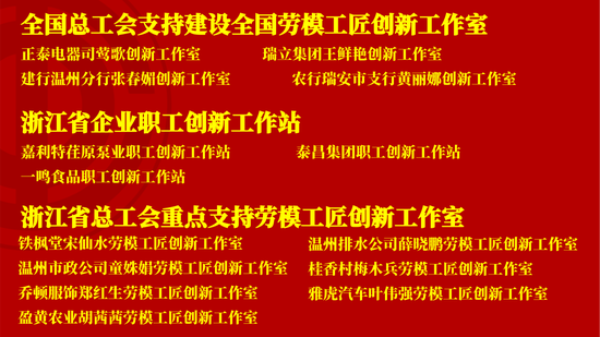 会议表彰了大国工匠、大国工匠浙江培育对象;全国总工会支持建设全国劳模工匠创新工作室、浙江省企业职工创新工作站、浙江省总工会重点支持劳模工匠创新工作室;省级提升职工生活品质单位。会议传达了全国两会精神,温州市委常委会、温州市政府与温州市总工会联席会议精神,审议通过相关工作报告与决议,替增补委员会委员、经审委员。