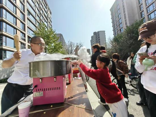 活动现场,二手玩具、手工漆扇、自制水饺等特色摊位一字排开,不少摊主都是因往届樱花汇结缘的邻里。一个个摊位,成为邻里相识、相伴的纽带,让陌生的邻居变成熟悉的朋友。