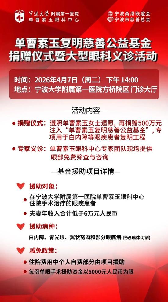 4月7日下午2时,单曹素玉复明慈善公益基金捐赠仪式暨大型眼科义诊活动将于宁波大学附属第一医院方桥院区门诊大厅温暖启幕。