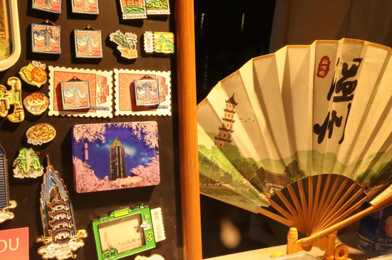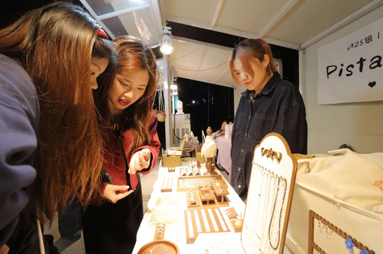 “我们主做温州主题文创,今年专门设计了‘世贸樱花环’系列的流沙冰箱贴、金属徽章,还有采纳顾客建议设计的反转片。”饱塔文创摊位负责人丹丹说,正是去年夜樱意外爆火、景点一夜之间出圈的景象,让她果断决定在此设摊。