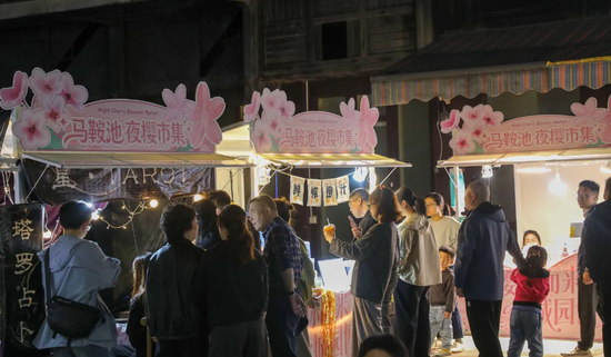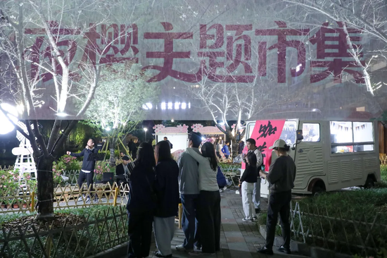 春日花展热辣滚滚烫的背后,有别出心裁的场景设计,更有消费场景创新的主动探索。本次的夜樱主题市集集结了20余个文创、美食摊位,将赏花人流转化为消费客流。