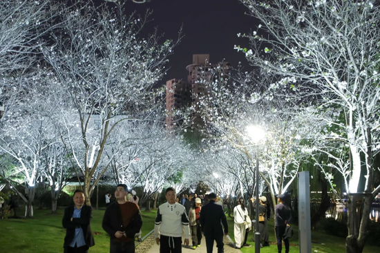 如何让樱花“开得更久”,让游客拍得尽兴?近年来,马鞍池公园将原本散落在公园各处的72棵樱树通集中迁移、科学搭配,成功打造出连绵的“樱花走廊”景观,并增设46盏投射灯与壁灯,拓展夜樱观赏新场景。从此,无论日访还是夜游,游客都能与樱花不期而遇,感受昼夜不同的诗意。