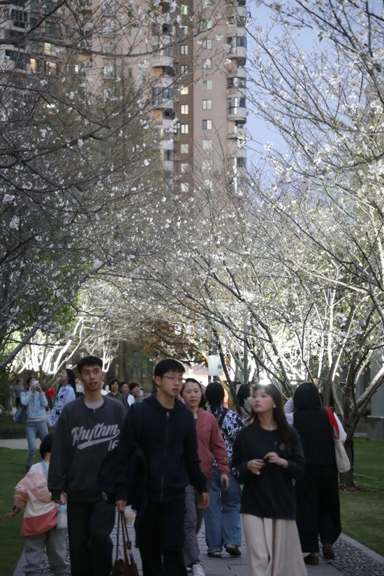 这一举措也意外催生了火爆全城的“世贸樱花环”经典视角——樱花枝桠与远处世贸大厦同框,成为无数市民手机里的“屏保级”照片。