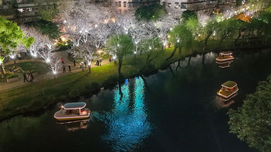 马鞍池公园首开夜间游船,创新推出“水陆共赏”的立体游览布局,让传统赏花向沉浸式体验升级。岸上灯火璀璨,樱花似雪盛放;湖上光影交错,游客泛舟赏樱。游船商户李先生说:“我们面向登船市民提供免费茶点。一边品茗,一边游湖,一边赏樱,丰富大家的赏花体验。”