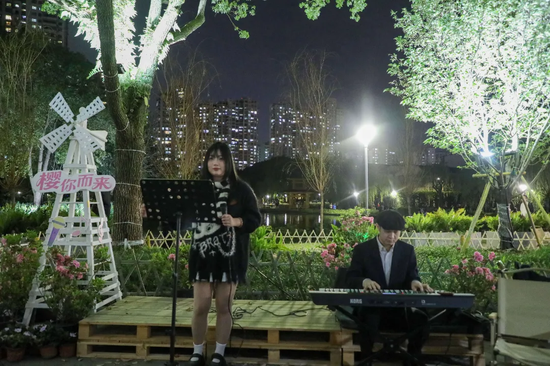 邻近樱花园还设有一个小而美的“樱花舞台”,爵士乐队现场演奏,为市民带来“文艺赋美”的惊喜,让赏樱成为融合视觉、听觉、氛围与情绪的立体场景。
